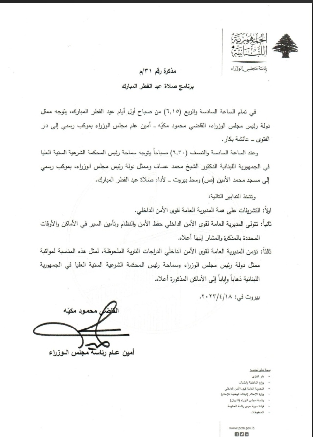 صدرَ عن رئاسة مجلس الوزراء اليوم الخميس , مذكرة حول برنامج صلاة عيد الفطر المبارك: