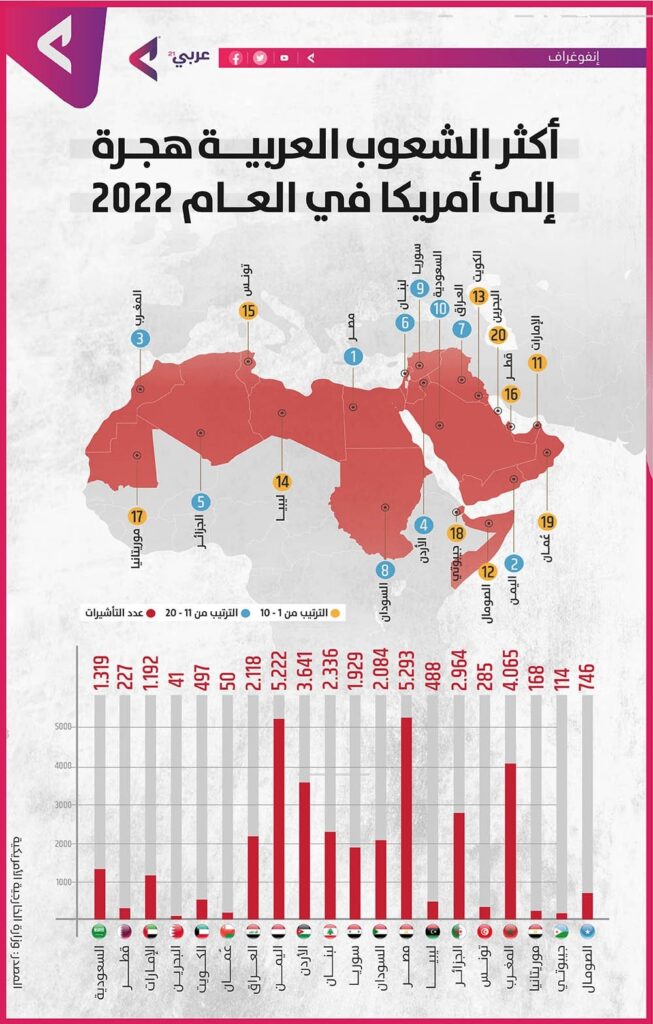 وفي ما يأتي إنفوغراف بعدد تأشيرات الهجرة من الدول العربية إلى الولايات المتحدة: