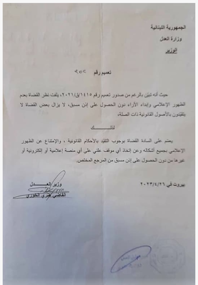 أصدر وزير العدل في حكومة تصريف الأعمال هنري الخوري،اليوم الخميس , تعميمًا للقضاة قضى بـ”وجوب التّقيّد بالأحكام القانونيّة، والامتناع عن الظّهور الإعلامي بجميع أشكاله، وعن اتّخاذ أيّ موقف علني على أيّ منصّة إعلاميّة أو إلكترونيّة أو غيرها، من دون الحصول على إذن مسبق من المرجع المختص”.