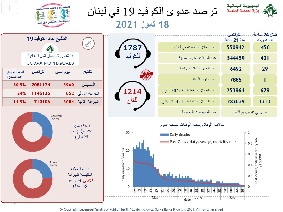 أعلنت وزارة الصحة العامّة في تقريرها اليومي حول مستجدات فيروس كورونا اليوم الأحد, عن ” تسجيل 450 إصابة جديدة بكورونا ( 421 محلية و29 وافدة) ليصبح العدد الإجمالي للإصابات 550942″.