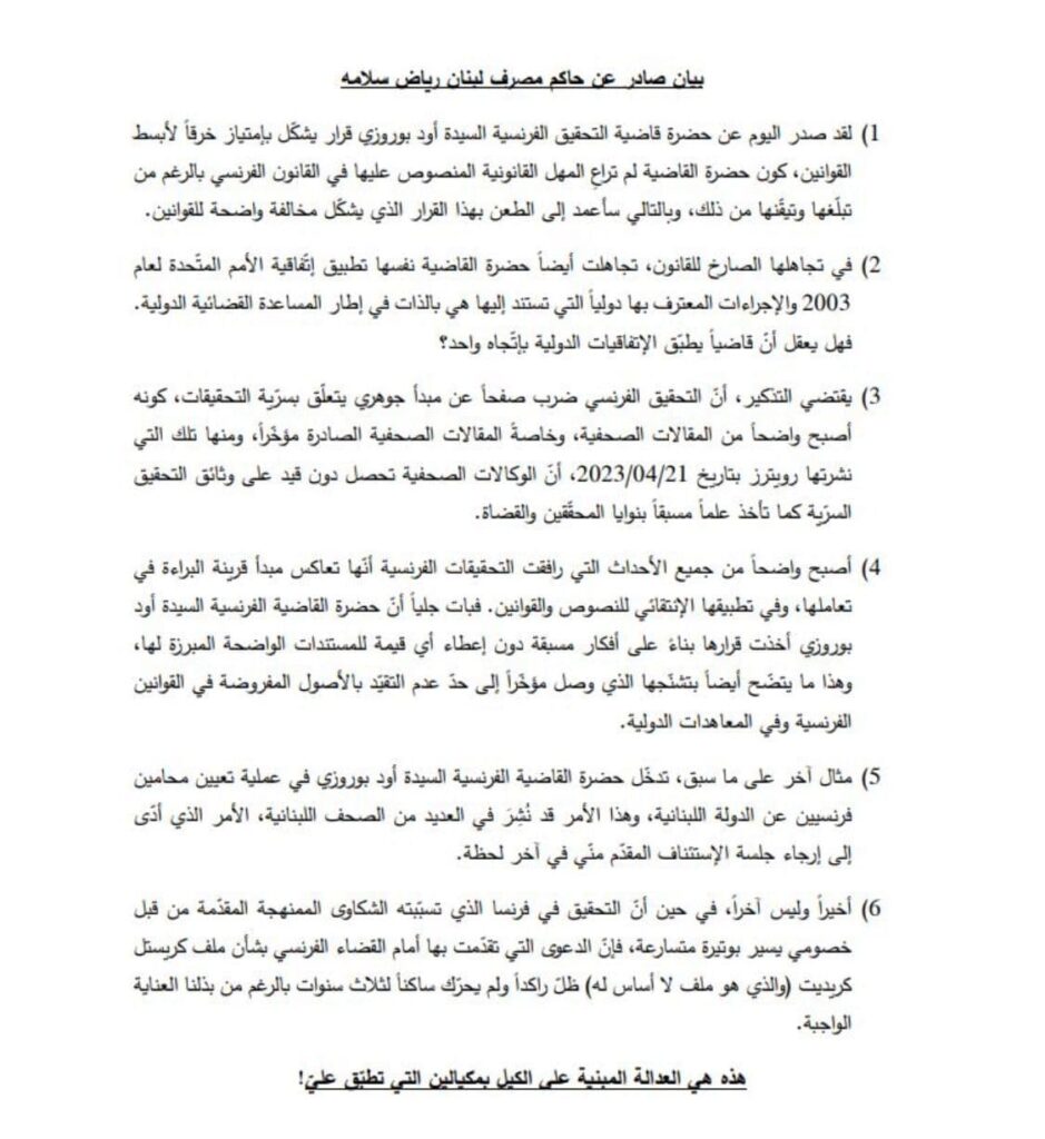 ردّ حاكم مصرف لبنان رياض سلامة على القرار الصادر عن القاضية الفرنسية أود بوروزي، معلناً أنه سيطعن به.