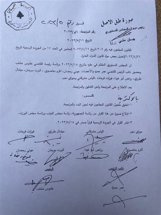 أصدر المجلس الدستوري اليوم الخميس برئاسة القاضي طنوس مشلب وبحضور نائب رئيس المجلس القاضي عمر حمزة وعدد من اعضاء المجلس قرارا يقضي بتعليق مفعول قانون تمديد صلاحيات المجالس البلدية والاختيارية لمدة أقصاها سنة واحدة، بذرائع عدم تأمين الحكومة التمويل المالي اللازم لإجراء الانتخابات في موعدها لحين البت والمراجعة