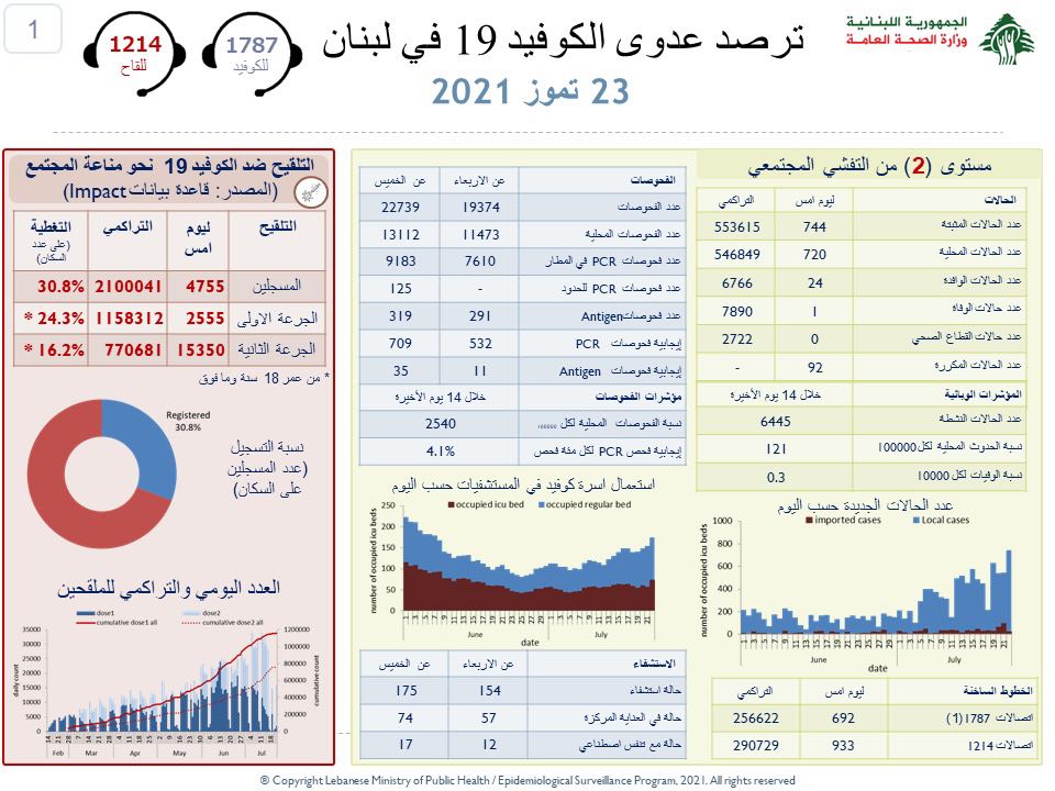 أعلنت وزارة الصحة العامّة في تقريرها اليومي حول مستجدات فيروس كورونا اليوم الجمعة, عن “تسجيل 744 إصابة جديدة بكورونا (720 محلية و24 وافدة) ليصبح العدد الإجمالي للإصابات 553615”.