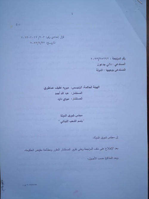 بما أن المستدعي – مدير عام الصناعة داني جدعون – تقدم بواسطة وكيله القانون بمراجعة لدى هذا المجلس بتاريخ 13/4/2023 سُجّلت برقم 25292/2023، يطلب بموجبها وقف تنفيذ وإبطال القرارات (…) الصادرة عن وزير الصناعة في حكومة تصريف الأعمال، ومن ثم تضمين المستدعى بوجهها رسوم ومصاريف المحكمة.