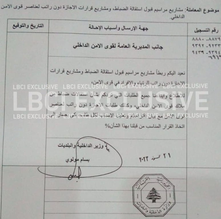 وبحسب الوثيقة، فقد طلب المولوي من المديرية العامة لقوى الأمن، إيداعه جميع الطلبات التي ترد إليها بشأن إستقالات ضباط من ملاك قوى الأمن، وكذلك طلبات الإجازة من دون راتب للعناصر الأمنية، وذلك مع بيان اقتراحها وتعليل الأسباب لكل طلب كي يُصار إلى إتخاذ القرار المناسب بهذا الشأن.