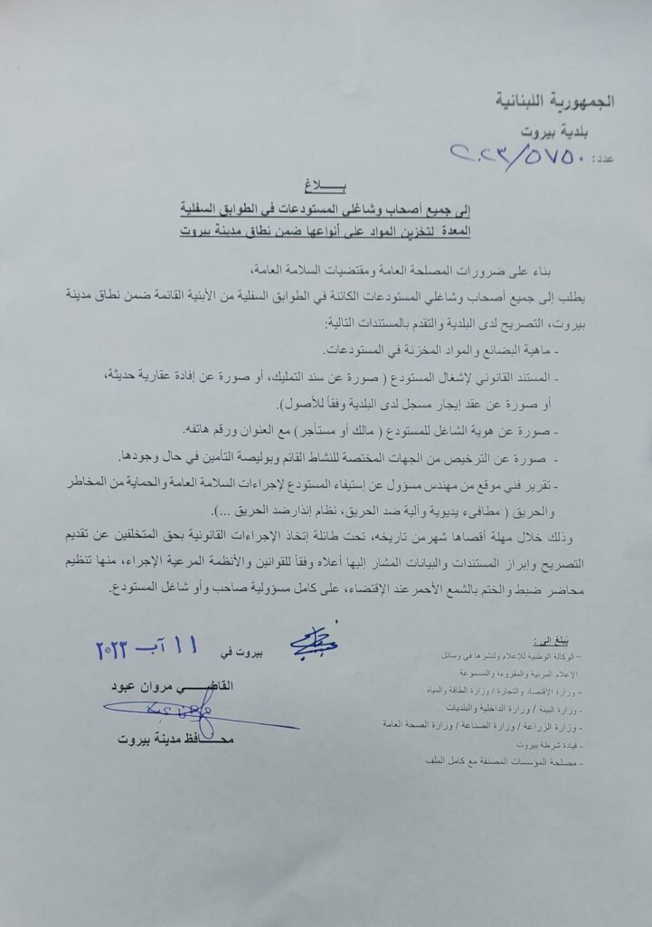 أصدر محافظ مدينة بيروت القاضي مروان عبود، بلاغاً إلى جميع أصحاب وشاغلي المستودعات في الطوابق السفلية المعدة لتخزين المواد على أنواعها ضمن نطاق مدينة بيروت، وجاء فيه: