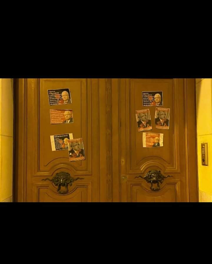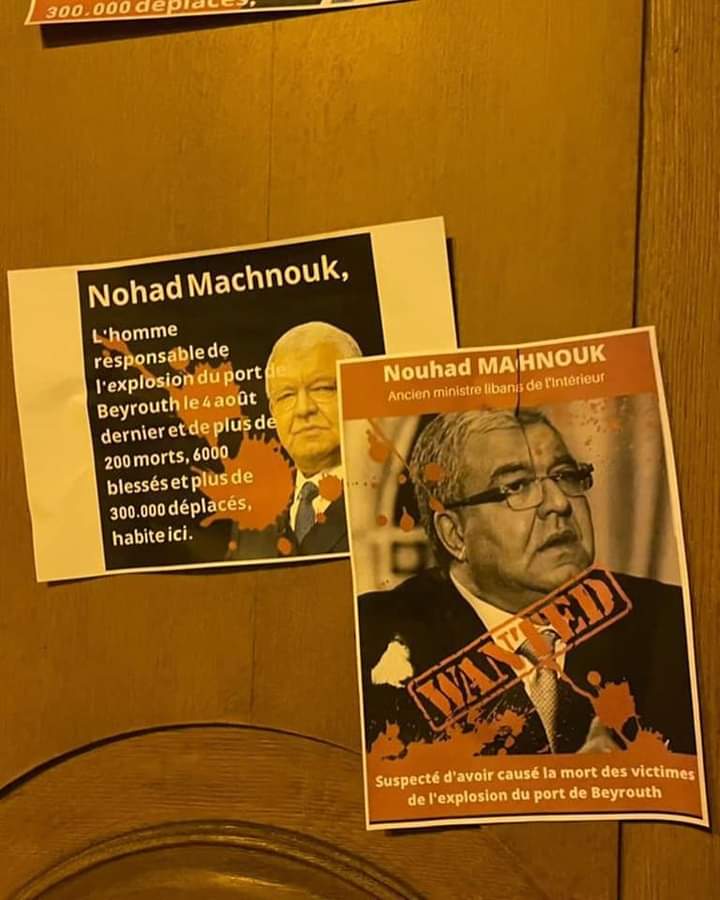 نشر الناشط أنطوني باخص دويهي عبر حسابه الخاص على موقع “تويتر”، مجموعة من الصور التي ظهر إقدام مجموعة من الناشطين اللبنانيين في فرنسا على لصق صور للنائب نهاد المشنوق على أبواب منزله في العاصمة باريس، الذي يحمل العنوان “باريس، الجادة ١٦، Arrondissement 16”. وكتب على الصور “مطلوب.. مشتبه به بالتسبب بإنفجار مرفأ بيروت وسقوط مئات الضحايا والجرحى”.وقال دويهي في منشوره: “المدعى عليه وزير الداخلية السابق النائب السابق نهاد المشنوق في باريس من الشعب اللبناني ممثلا بالمحقق العدلي. كل السياسيين يسمعوا منيح من هلق ورايح كل واحد منكم بيملك منزل او شركة او مكتب او اي عقار يللي اشتراها من مال وتعب الشعب اللبناني لح يكونوا عرضة للهجوم ، مش بس بلبنان منوصل عليكم بل باي بلد بالعالم. ردوا مال الشعب اللبناني او لح تكون ممتلكاتكم من ضمن الاهداف”.