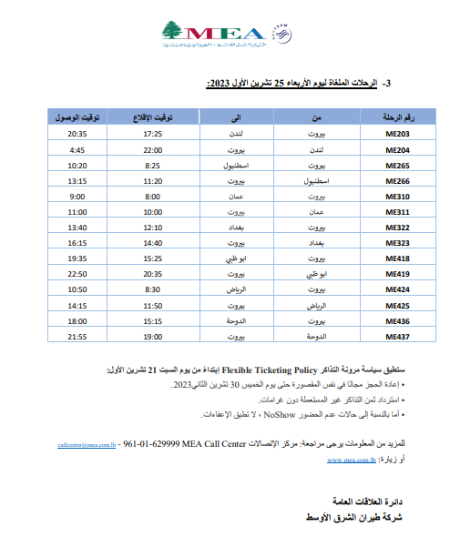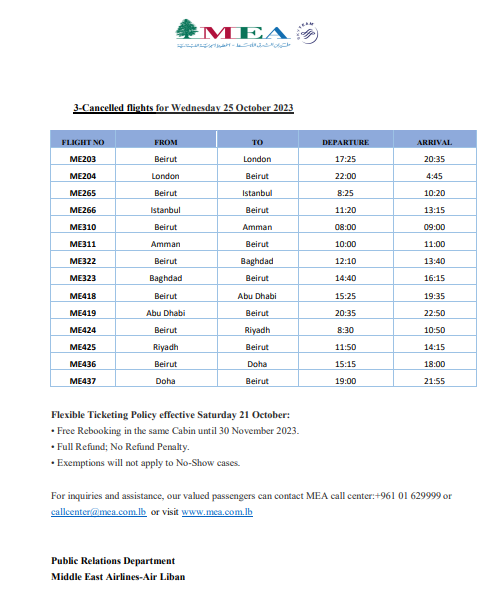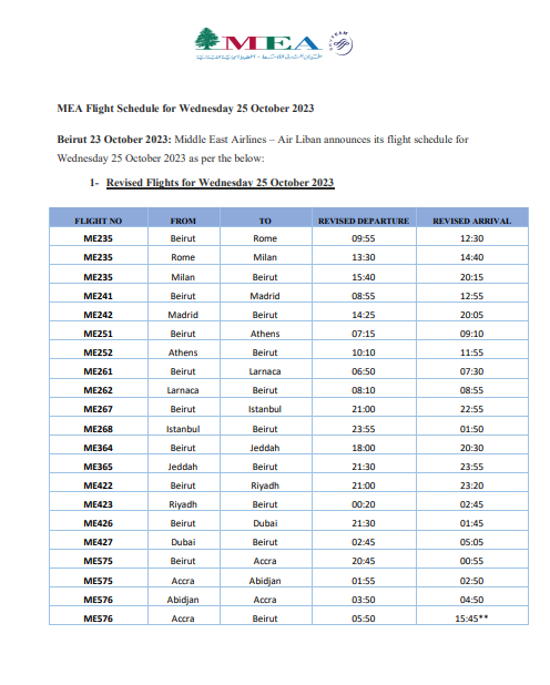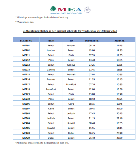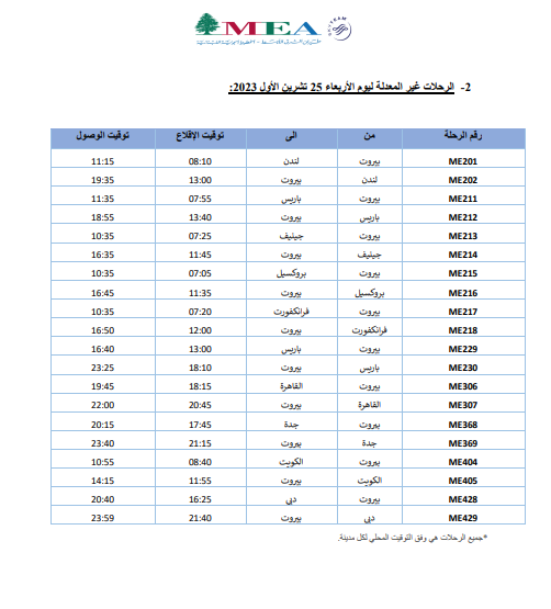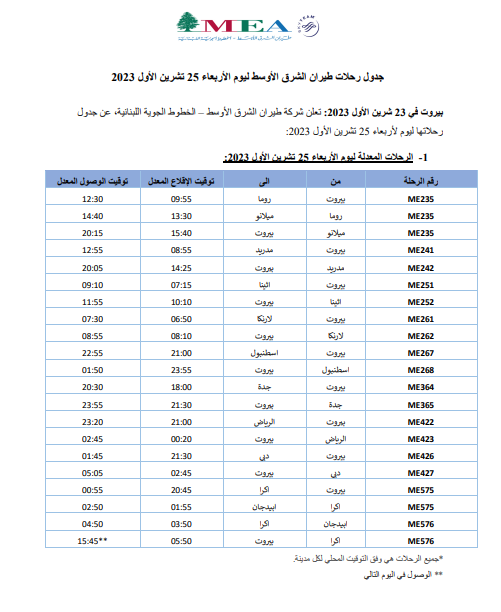 أعلنت شركة طيران الشرق الأوسط -الخطوط الجوية اللبنانية، عن جدول رحلاتها ليوم الأربعاء 25 تشرين الأول 2023.