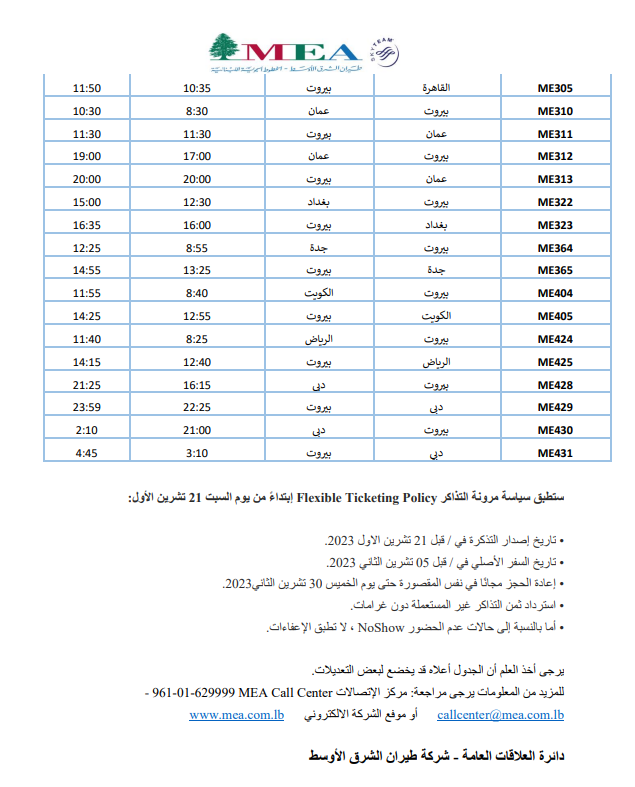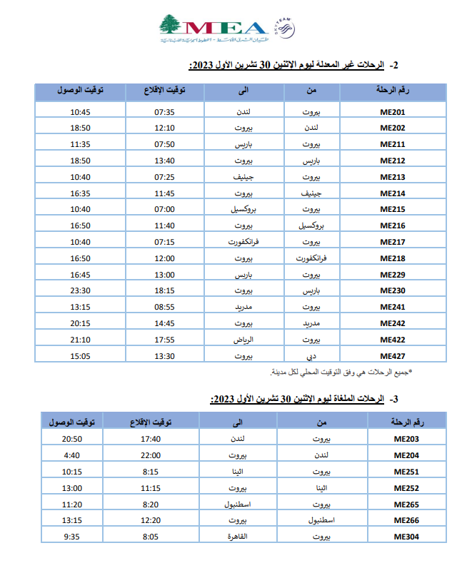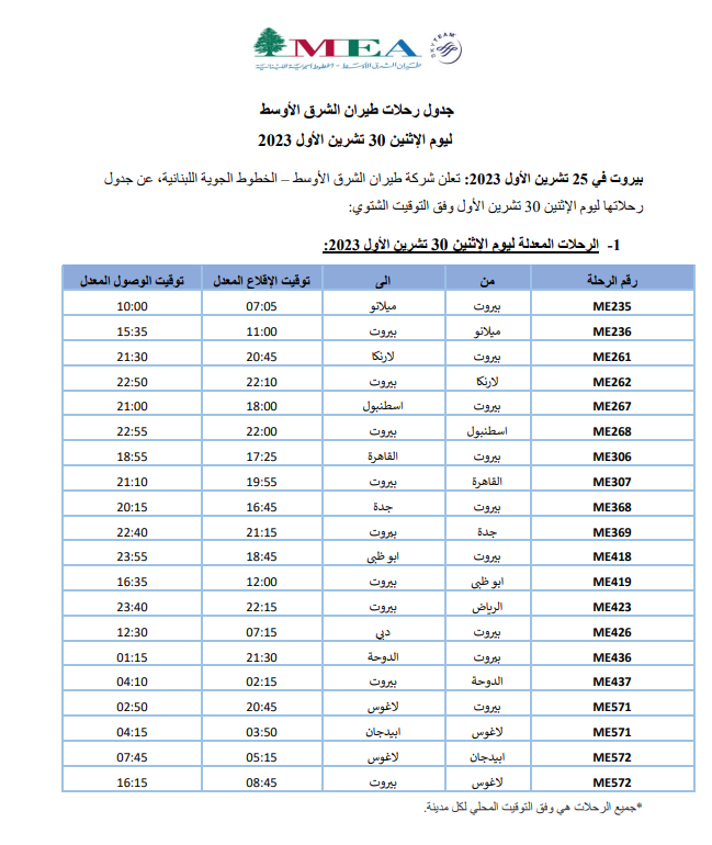 اعلنت شركة طيران الشرق الأوسط – الخطوط الجوية اللبنانية، عن جدول رحلاتها ليوم الإثنين 30 تشرين الأول وفق التوقيت الشتوي.