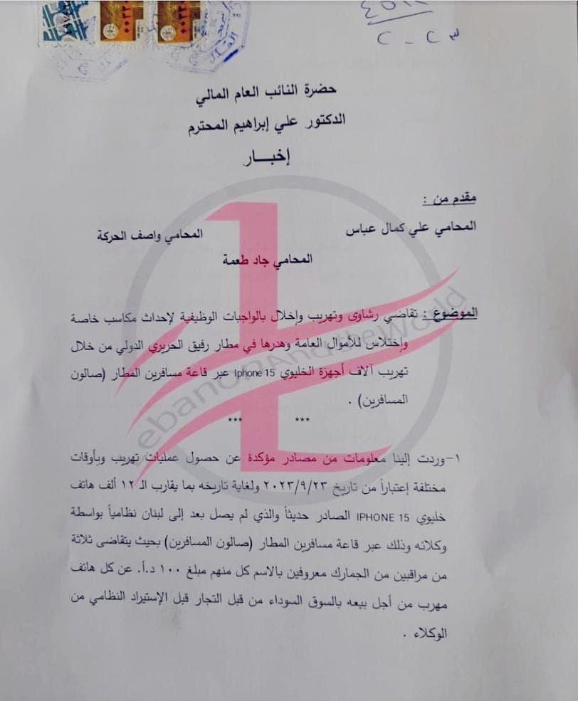 تقدم ثلاثة محامين بإخبارٌ لدى لنيابة العامة المالية يتعلق بقيام ثلاثة مراقبين في جمارك المطار – صالة المسافرين بتسهيل تهريب أجهزة خليوية من نوع iphone 15، مقابل تقابل رشاوى مالية قيمتها 100$ عن كل جهاز.