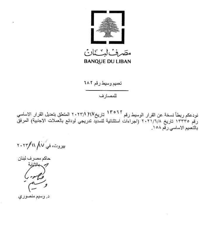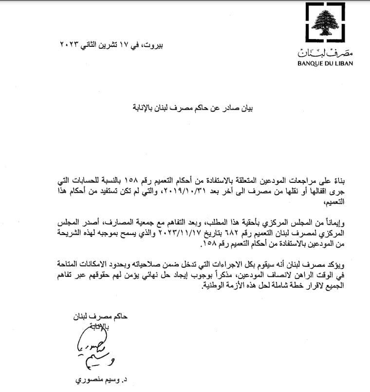 صدر عن حاكم مصرف لبنان بالإنابة وسيم منصوري بيان بشأن أحكام التعميم رقم 158، وتعميم وسيط يتعلق بالإجراءات التدريجية لتسديد تدريجي لودائع بالعملات الأجنبية.