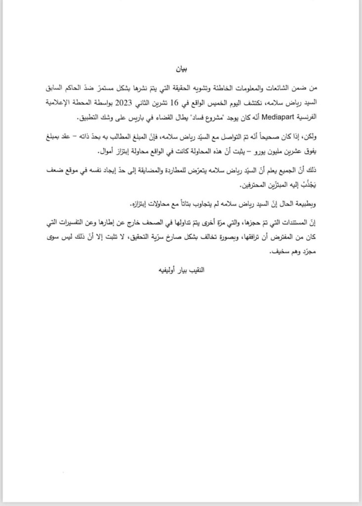 صدر بيان توضيحي عن محامي الحاكم السابق لمصرف لبنان رياض سلامة، المحامي الفرنسي بيار أوليفييه سور.