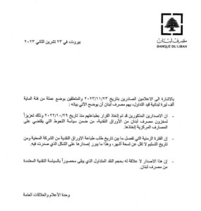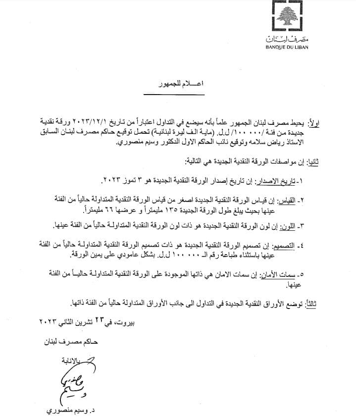 صدر عن وحدة الاعلام والعلاقات العامة في مصرف لبنان بيان، اشار الى انه “بالاشارة الى الاعلامين الصادرين بتاريخ 23/11/2023 والمتعلقين بوضع عملة من فئة الماية الف ليرة لبنانية قيد التداول، يهم مصرف لبنان ان يوضح الاتي بيانه: