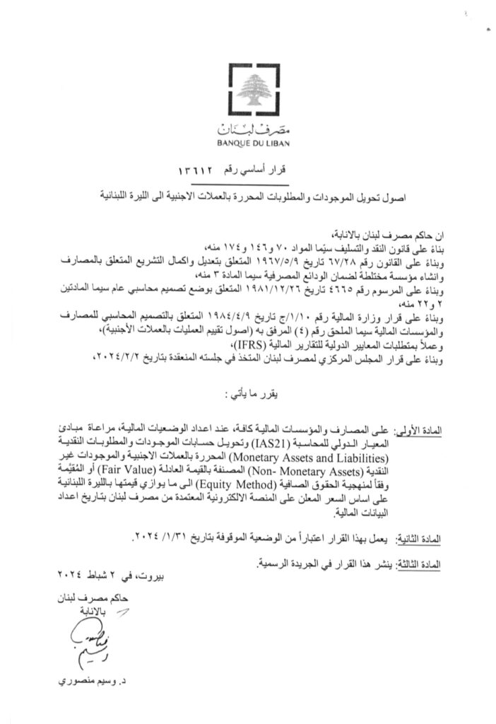 صدر عن مصرف لبنان تعميم للمصارف والمؤسسات المالية.