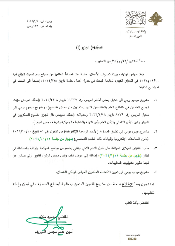 يعقد مجلس الوزراء بهيئة تصريف الاعمال، جلسة نهار السبت في 10 الحالي في السراي، لمتابعة البحث في جدول أعمال جلسة 8/2/2024، كما سيتم البحث في المواضيع المذكورة في الصّورة أدناه.