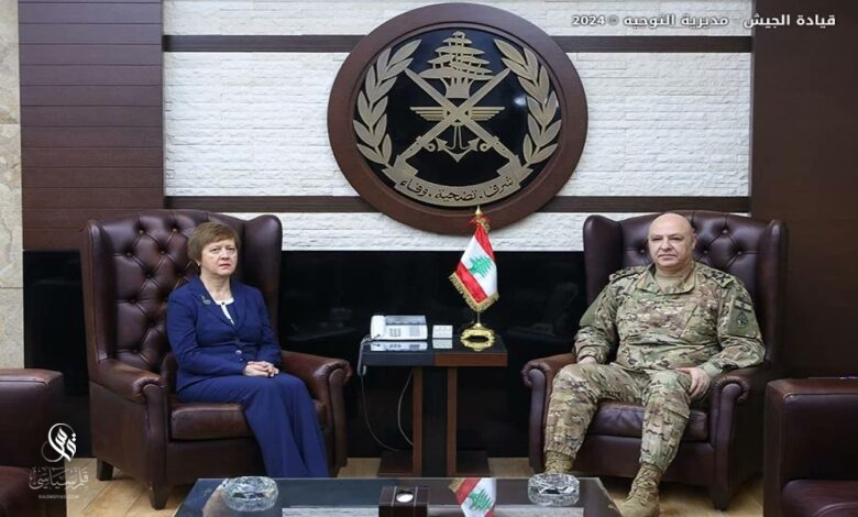 استقبل قائد الجيش جوزاف عون في مكتبه في اليرزة المنسقة الخاصة للأمين العام للأمم المتحدة في لبنان Joanna Wronecka، وتناول البحث الأوضاع العامة في البلاد والتطورات على الحدود الجنوبية.