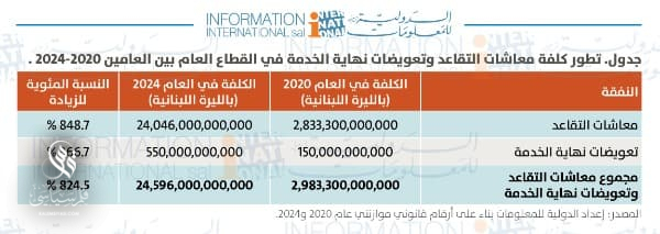 ووفق “الدولية للمعلومات”، بلغت كلفة معاشات التقاعد وتعويضات نهاية الخدمة في القطاع العام المقدرة في العام 2024: 24,596,000,000,000 ليرة لبنانية (نحو 274.8 مليون دولار أميركي على سعر الصرف المحدد من قبل وزارة المال بتاريخ 23/02/2024).
