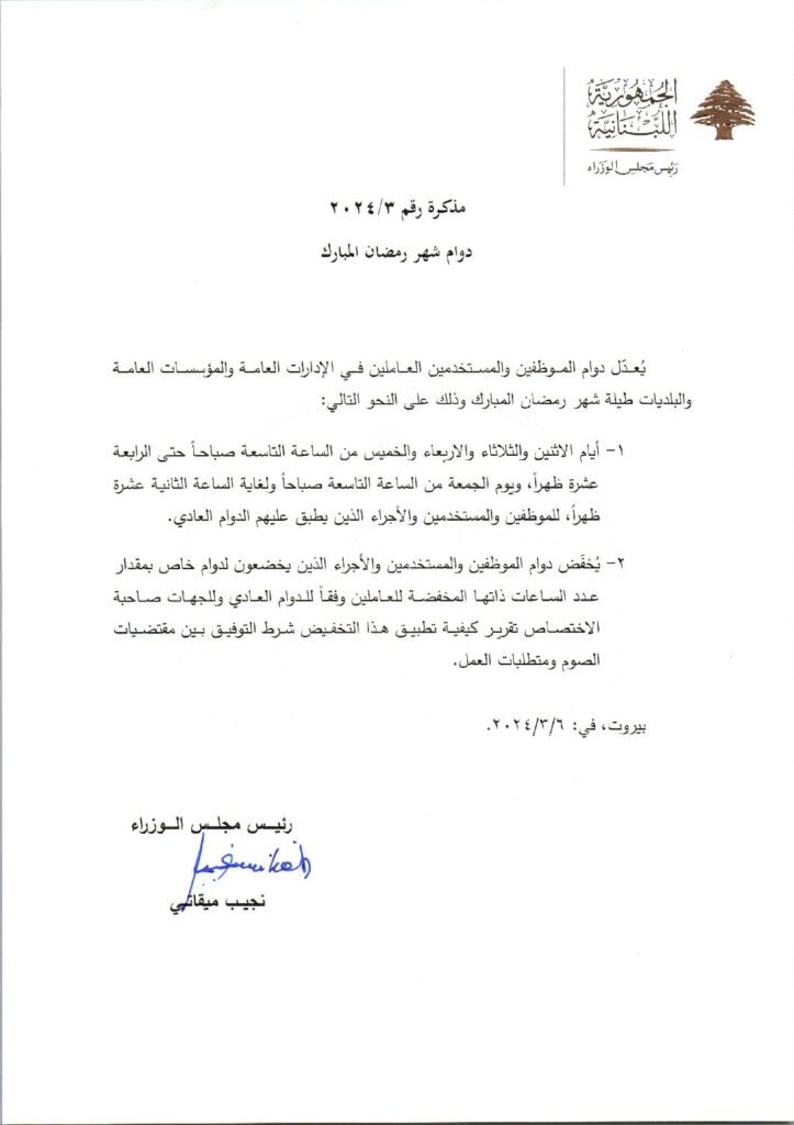 صدر عن مجلس الوزراء مذكرة حول دوام عمل الموظفين والمستخدمين والعاملين في الإدارات والمؤسسات العامة والبلديات خلال شهر رمضان.