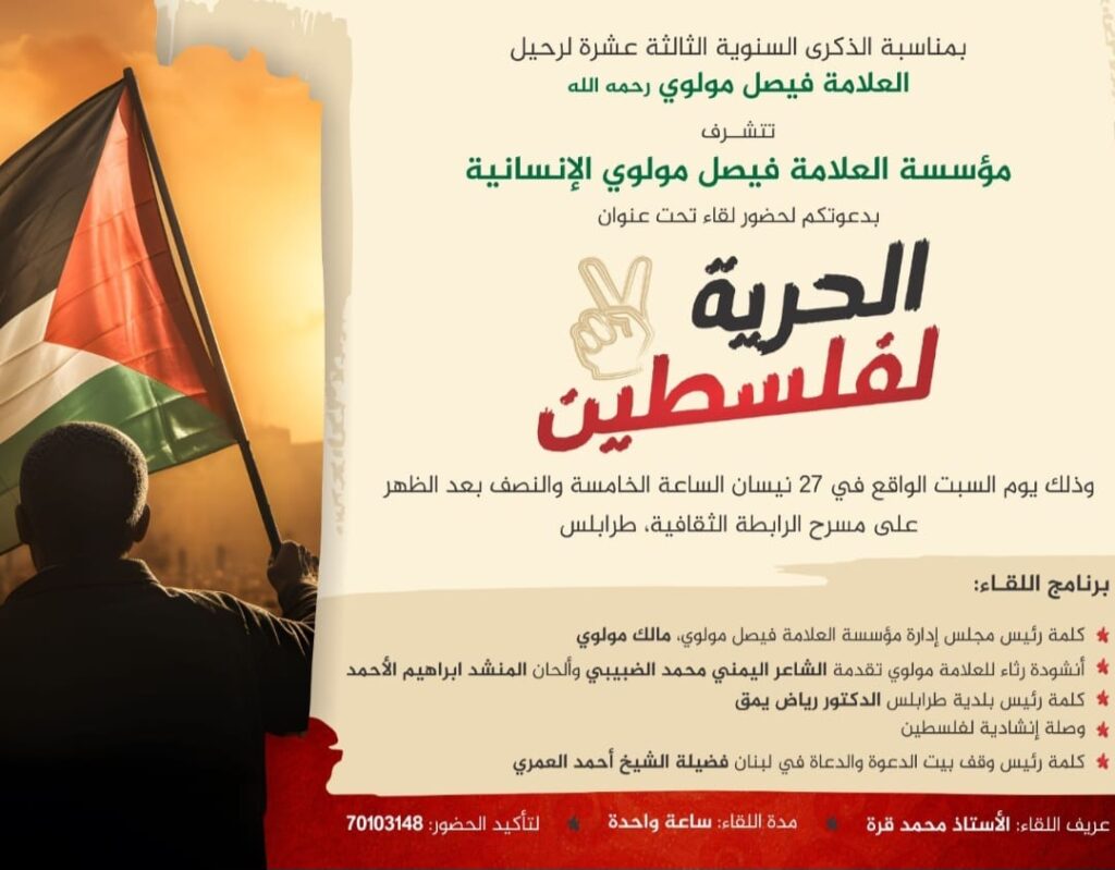 دعا رئيس مجلس إدارة مؤسسة العلامة فيصل مولوي مالك مولوي لحضور لقاء تحت عنوان: الحرية لفلسطين