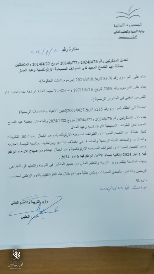 أعلنت وزارة التربية تعديل المذكرتين المتعلقتين بعطلة عيد الفصح لدى الطوائف المسيحية الأرثوذكسية وعيد العمّال، لتبدأ صباح الأربعاء 1 أيار 2024 ولغاية مساء الاثنين 6 أيار 2024.