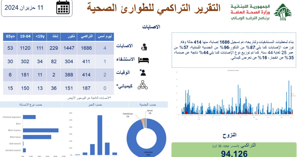 نشرت وزارة الصحة العامة متابعةً للعدوان الإسرائيلي على لبنان، التقرير التراكمي للطوارئ الصحية لـ11 حزيران 2024، وقد تم تسجيل 1686 إصابة، 414 منها حالات وفاة.