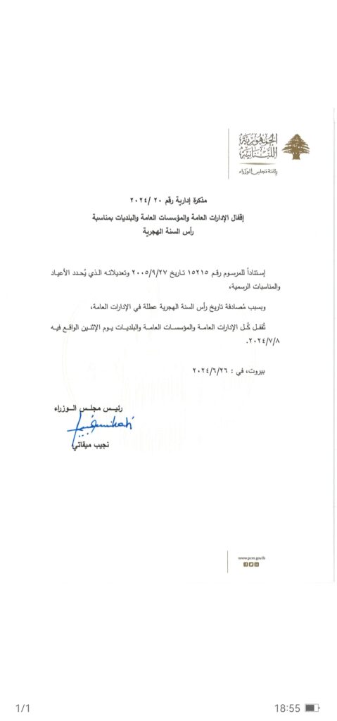 صدر عن رئاسة مجلس الوزراء مذكرة إدارية رقم 20/2024 قضت بإقفال كل الإدارات والمؤسسات العامة والبلديات الإثنين في 8 تموز المقبل، بمناسبة رأس السنة الهجرية.