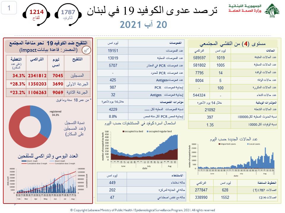 أعلنت وزارة الصحة العامّة في تقريرها اليومي حول مستجدات فيروس كورونا اليوم الجمعة، عن “تسجيل1019 إصابة جديدة بكورونا (1005محلية 14 وافدة) ليصبح العدد الإجمالي للإصابات589597”.