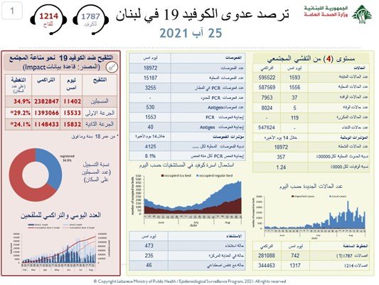أعلنت وزارة الصحة العامة، تسجيل 1593 إصابة جديدة بفيروس كورونا، و5 حالات وفاة.