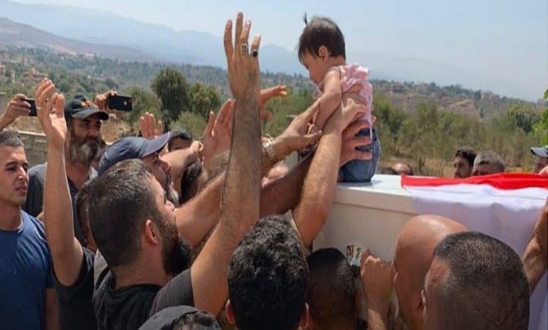كما رفع المشيعون طفله الوحيد في وداع والده.