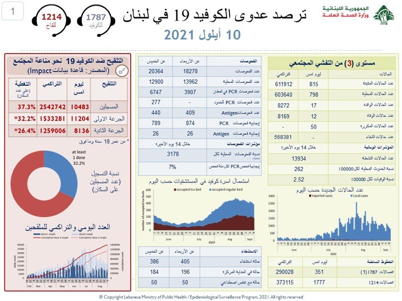 أعلنت وزارة الصحة العامة تسجيل 815 إصابة جديدة بفيروس كورونا، مما رفع العدد التراكمي للحالات المثبتة إلى 611912. كما تمّ تسجيل 12 حالة وفاة.