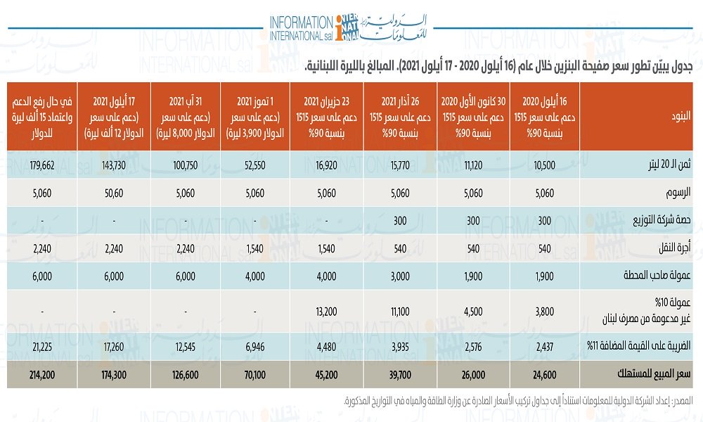 وزعت الدولية للمعلومات تقريرا بعنوان “صفيحة البنزين ارتفعت 150 ألف ليرة وبنسبة 608% في عام واحد” جاء فيه: