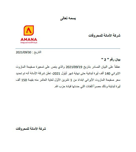 أعلنت شركة الأمانة للمحروقات، بأنه تم تحديد سعر صفيحة المازوت الايراني من 1 إلى 10 تشرين الأول بـ150 ألف ليرة، للفئات التي حددها ”حزب الله” حصراً.