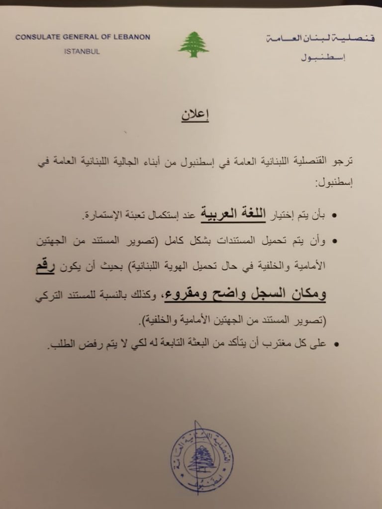 إستكمالاً لتعميم القنصلية اللبنانية في تركيا والذي نُشر بتاريخ ٤/١٠/٢٠٢١