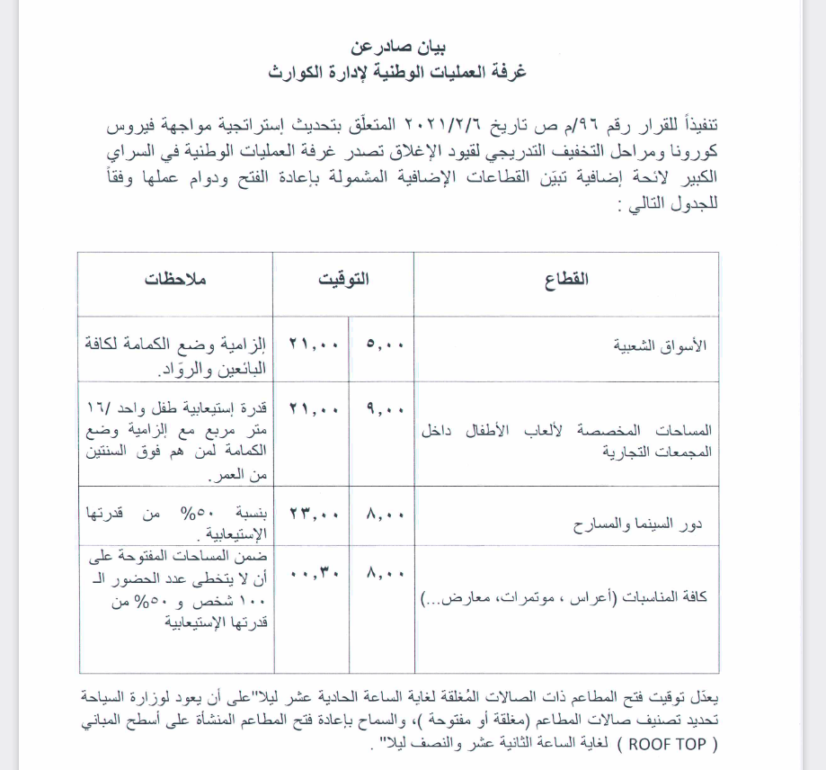 اعلنت غرفة العمليات الوطنية لادارة الكوارث أنه تنفيذا للقرار 96/م تاريخ 6/02/2021 المتلعق بتحديد استراتيجية فيروس كورونا. يضاف قطاعات إضافية مشمولة بإعادة الفتح.