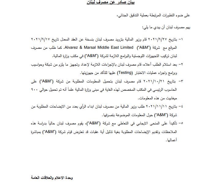 3 -بتاريخ 21/10/2021 قام مصرف لبنان بتحميل المعلومات المطلوبة من شركة “M&A” على الحاسوب الرئيسي في المكتب المخصص لهذه الغاية في مبنى وزارة المالية علماً أنّه تمّ تحميل حوالي 900 ميغابيت من هذه المعلومات.
