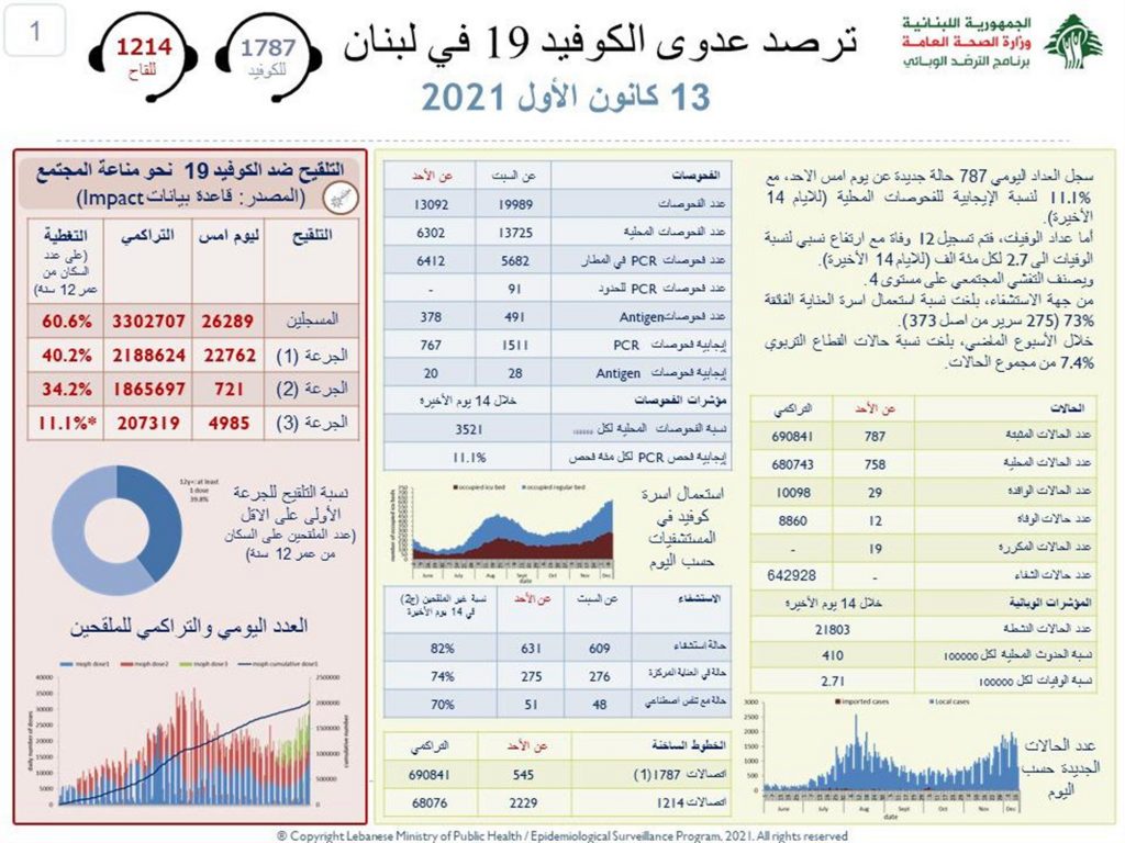 أعلنت وزارة الصحة العامة تسجيل 787 إصابة جديدة بفيروس كورونا في لبنان، ما يرفع العدد الإجمالي للمصابين إلى 690841.