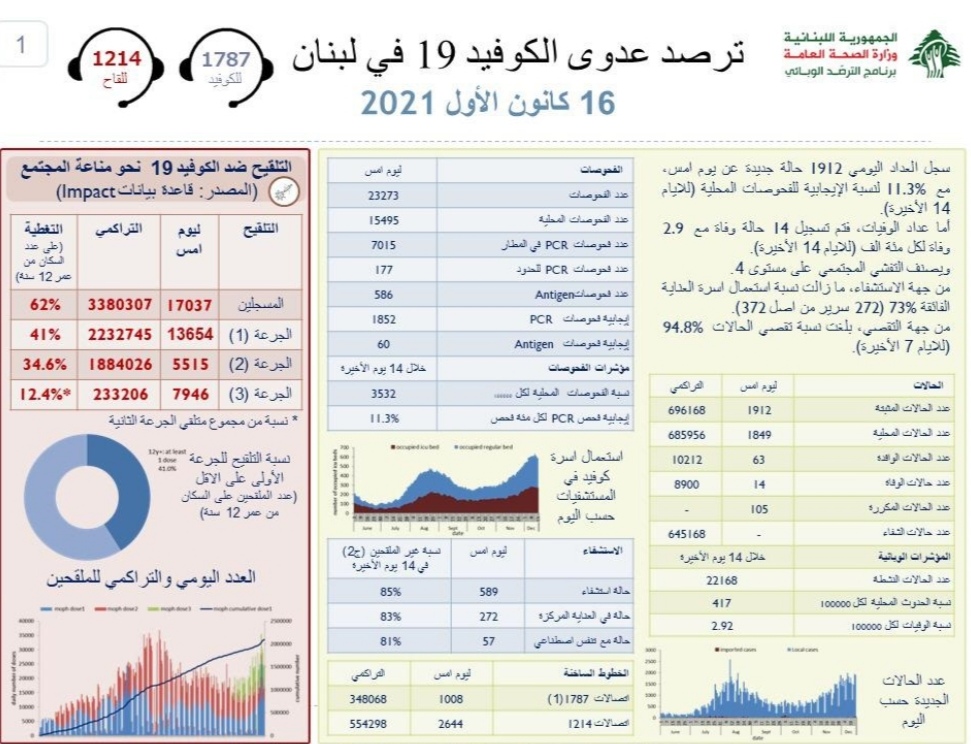 أعلنت وزارة الصحة العامة تسجيل 1912 إصابة جديدة بفيروس كورونا في لبنان، ما يرفع العدد الإجمالي للمصابين إلى 696168.
