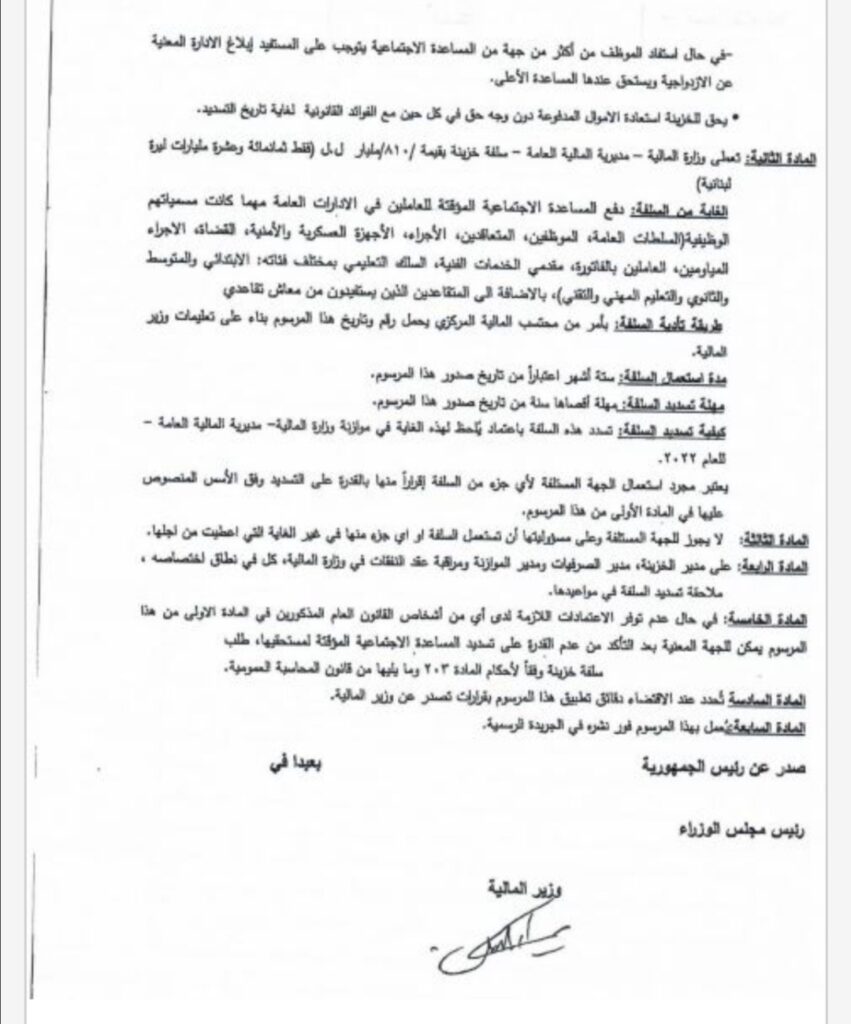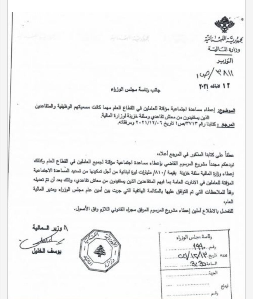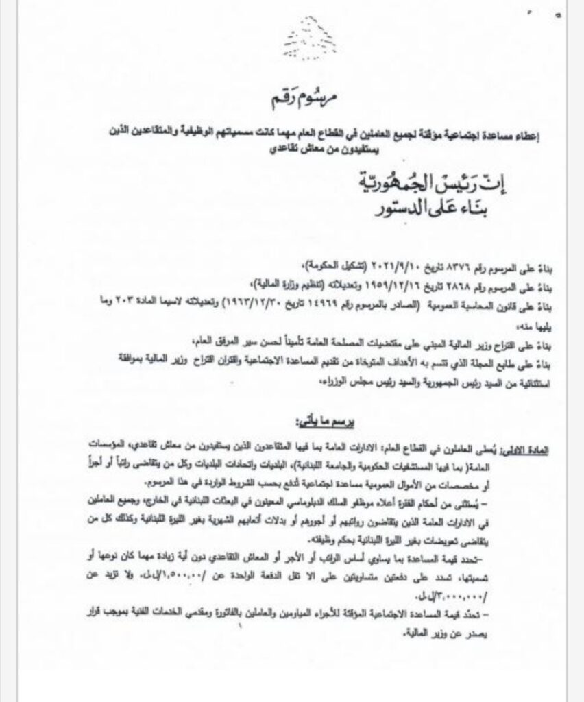 أعلنت رئاسة مجلس الوزراء اليوم السبت، عن “الصيغة الجديدة لمشروع المرسوم القاضي بأعطاء مبلغ مقطوع في القطاع العام يساوي أساس الراتب أو الأجر، يسدّد على دفعتين متساويبن على ألّا تقل الدفعة الواحدة عن 1،500،000 ل.ل. والا تزيد عن 3،000،000 ل.ل.”
