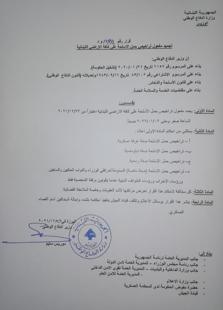 جمّد وزير الدفاع هانري خوري مفعول تراخيص حمل الأسلحة على كالة الأراضي اللبنانية اعتباراً من 23/12/2021 حتى 2/1/2021 ضمناً.