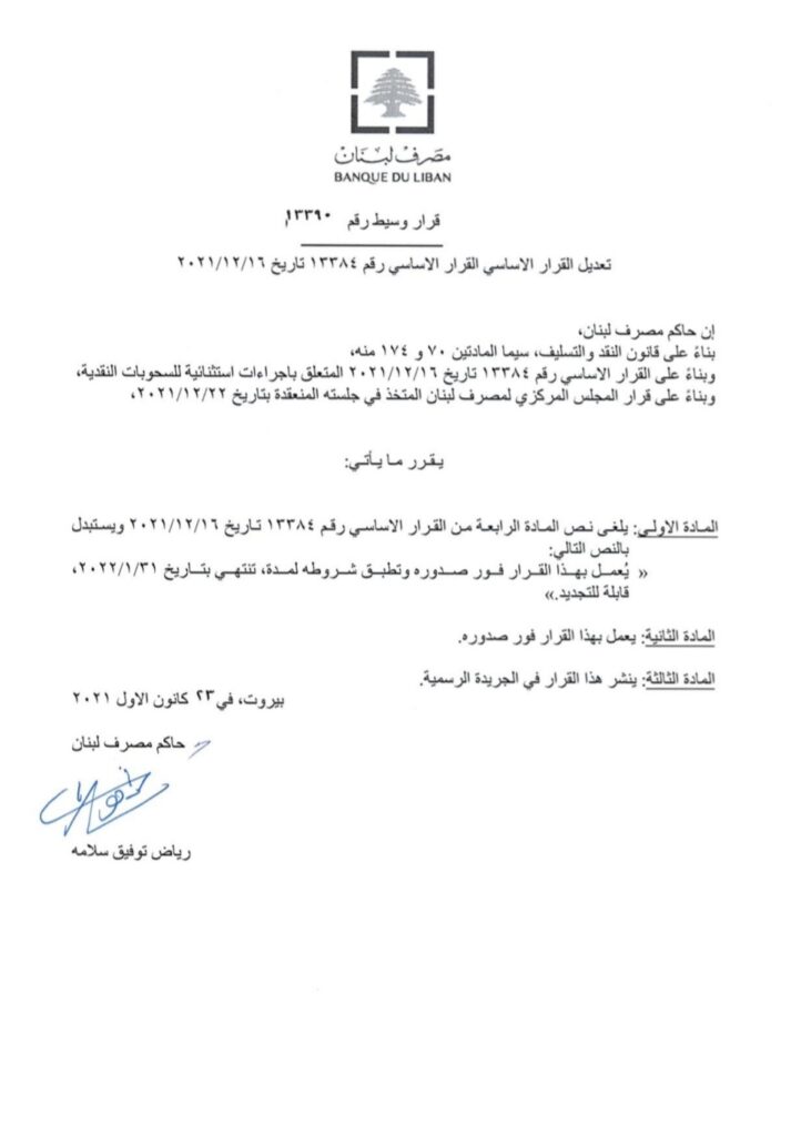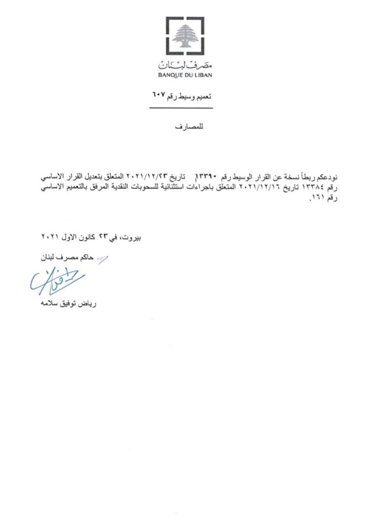 صدر عن مصرف لبنان تعميم وسيط رقم 607 يتعلق بإجراءات إستثنائية للسحوبات النقدية المرفق بالتعميم الاساسي رقم 161.