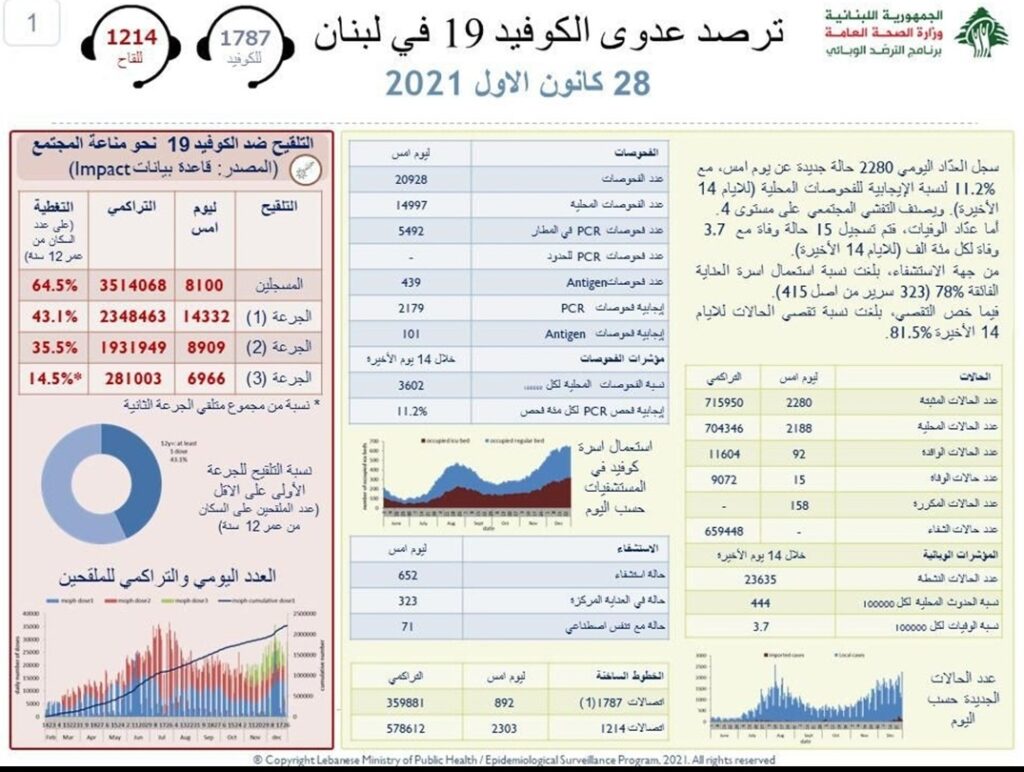 أعلنت وزارة الصحة العامة تسجيل 2280 إصابة جديدة بكورونا و15 حالة وفاة.