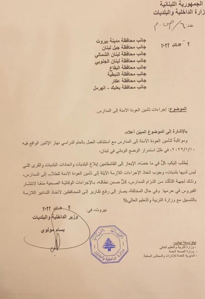 شدد وزير الداخلية والبلديات بسام مولوي على المحافظين والقائمقامين “ضرورة التقيد بمضمون القرار رقم ٦/ ص.م تاريخ ٢-١-٢٠٢٢، الصادر عن وزارة الداخلية والبلديات والقاضي باتخاذ البلديات كل الاجراءات اللازمة الآيلة الى العودة الآمنة للمدارس في ظل تفشي فيروس كورونا وذلك لجهة التأكد من مراعاة الشروط الصحية من قبل المدارس، على ان يتم عرض الواقع الصحي، كل في نطاقه، على وزارة التربية والتعليم العالي، صاحبة الصلاحية في اتخاذ قرار فتح المدارس او اقفالها، وذلك لاستصدار القرارات اللازمة عند الحاجة”.