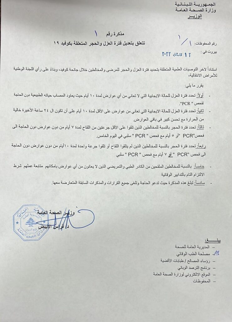 أصدرت وزارة الصحة العامة مذكرة تحمل الرقم 1 تتعلق بتعديل فترة العزل والحجر المتعلقة بكوفيد-19.