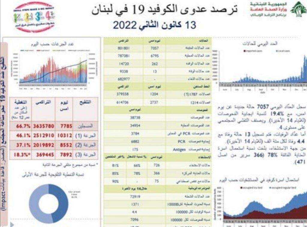 أعلنت وزارة الصحة العامة في تقريرها اليومي تسجيل ”  7057 إصابة جديدة بفيروس كورونا رفعت العدد التراكمي للحالات المثبتة الى 801801، كما تم تسجيل 13 حالة وفاة”.