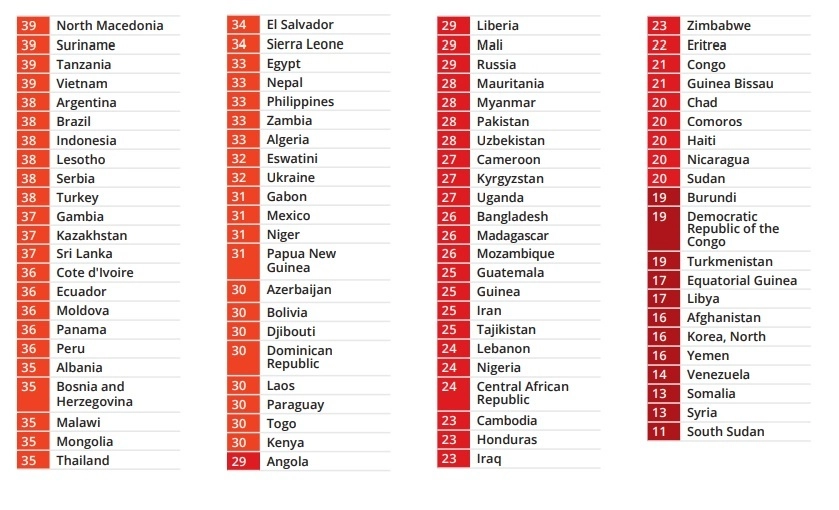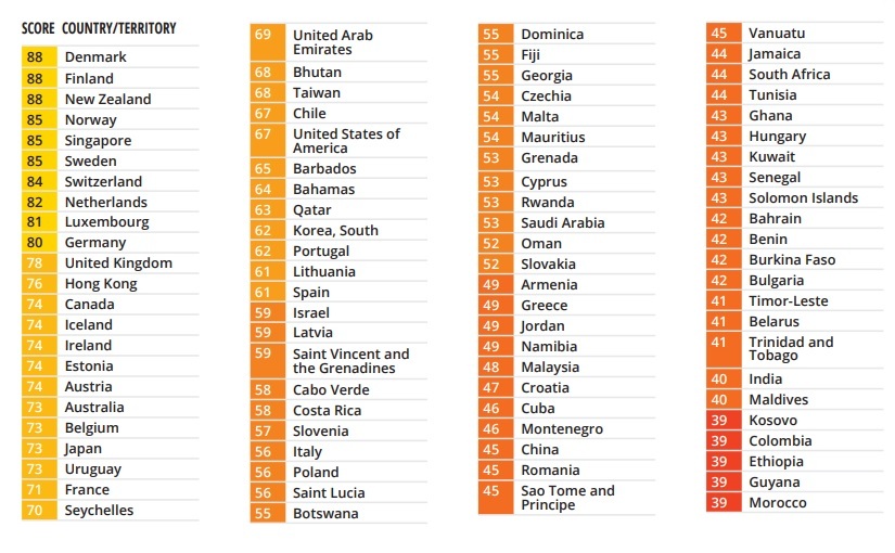 وفي ما يلي ترتيب دول العالم، الذي يعتمد على علامة من 100، يتدرج من الأقل إلى الأكثر فساداً: