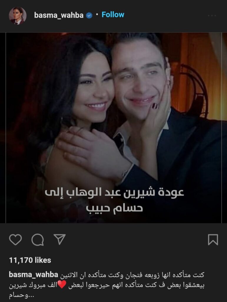 بدورها، أكدت الإعلامية المصرية بسمة وهبة خبر عودة الثنائي، إذ نشرت صورة تجمع الزوجين وكتبت عليها “عودة شيرين عبد الوهاب إلى حسام حبيب”، وعلّقت على الصورة كاتبة “كنت متأكدة إنها زوبعة بفنجان، وكنت متأكدة إن الاتنين بيعشقوا بعض، فكنت متأكدة إنهم حيرجعوا لبعض… ألف مبروك شيرين وحسام”.​