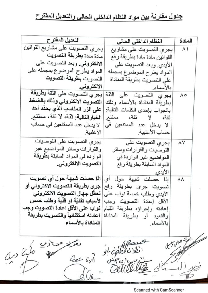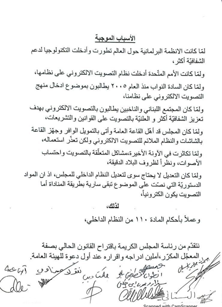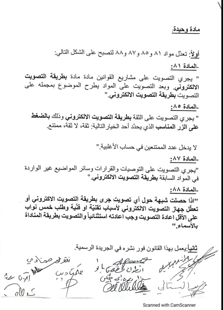 تقدم تكتل “لبنان القوي” باقتراح قانون تعديل بعض مواد من قانون النظام الداخلي لمجلس النواب ويتضمن تعديل طريقة التصويت على اقتراحات القوانين في اللجان والهيئات العامة ليصبح التصويت الكترونيًّا.