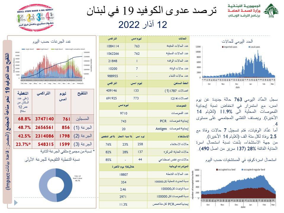 أعلنت وزارة الصحة العامة في تقريرها اليومي تسجيل 763 إصابة جديدة بفيروس كورونا رفعت العدد التراكمي للحالات المثبتة الى 1084114، كما تم تسجيل 7 حالات وفاة “