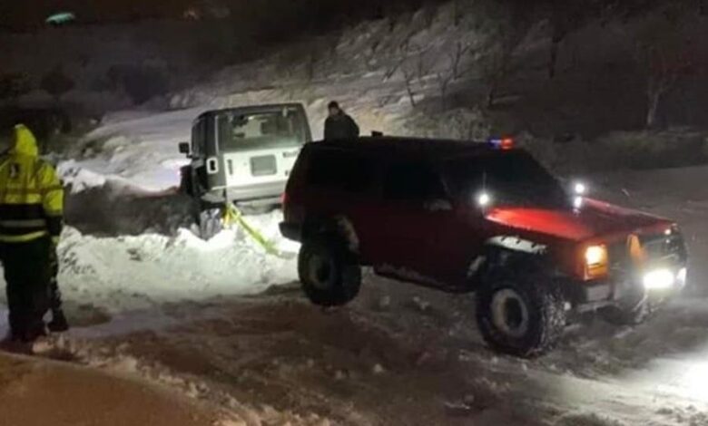 الدفاع المدني يسحب سيارة من وسط الثلوج