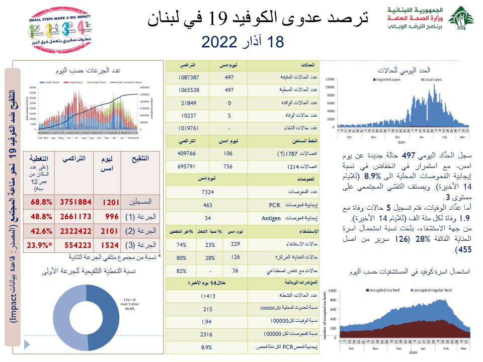 أعلنت وزارة الصحة العامة تسجيل 497 إصابة جديدة بفيروس “كورونا” في لبنان، ما يرفع العدد الإجمالي للمصابين إلى 1087387.